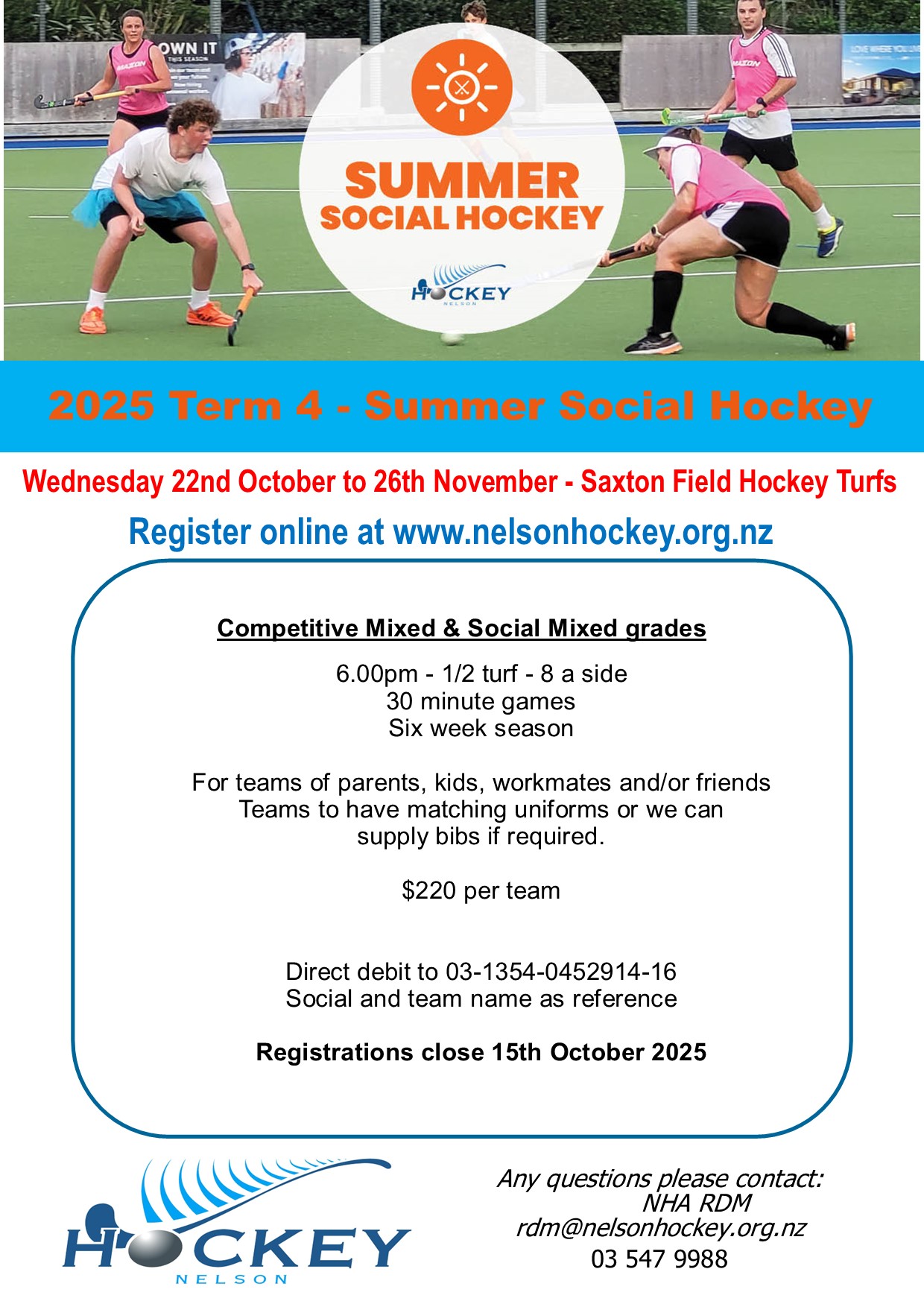 Gather your crew,…parents, kids, workmates, or mates…and hit the turf for six weeks of fast-paced, fun-filled hockey action!