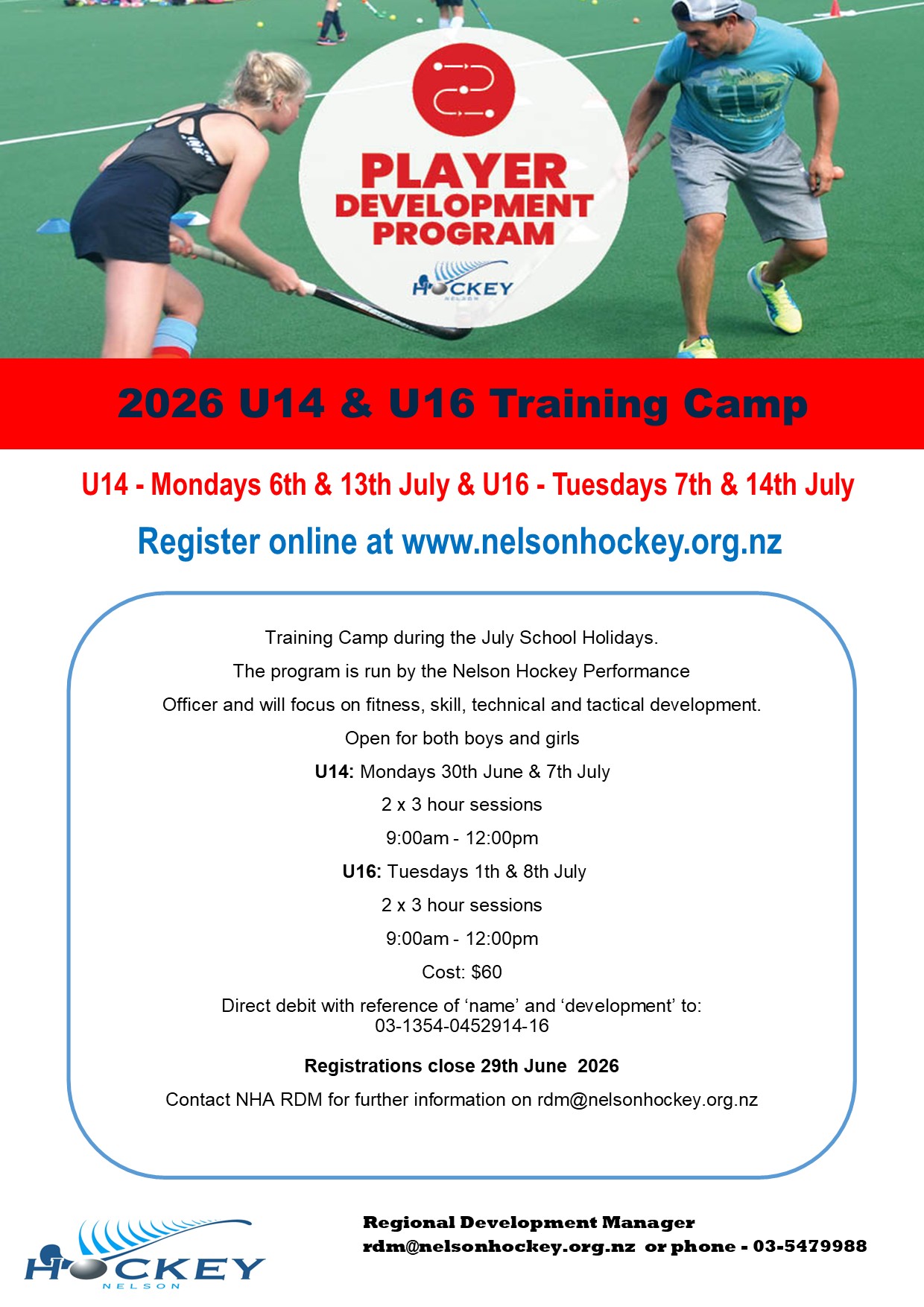 2026 U13 Training Camp July 13 @ 9:00 am - 12:00 pm Recurring NELSON HOCKEY SAXTON FIELDS, Nelson, Tasman/Nelson, New Zealand