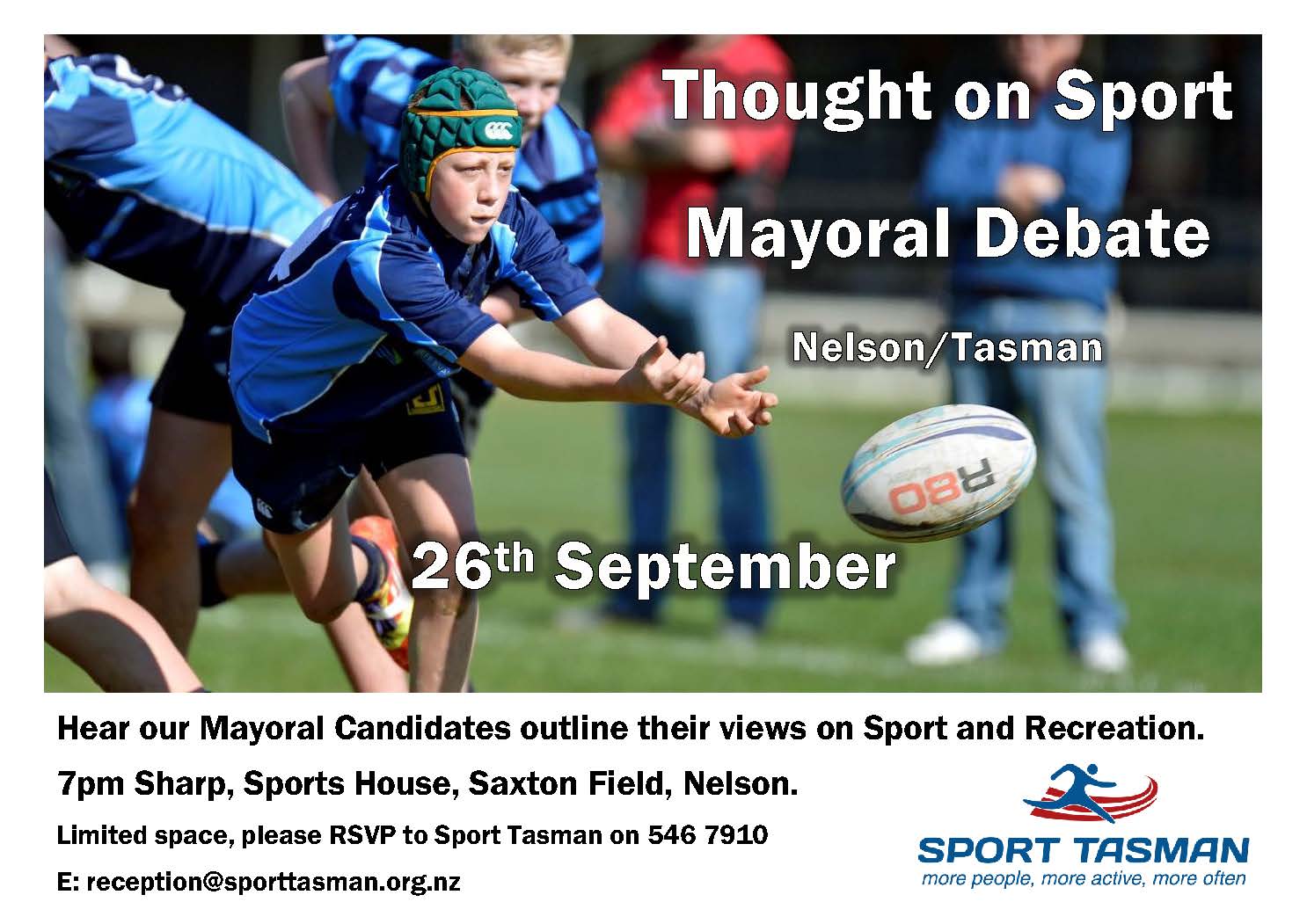 Sport Tasman is hosting a ‘Thought on Sport’ Mayoral Debate on Thursday 26th September at Sports House, Saxton field, Stoke, Nelson. Starts at 7pm.